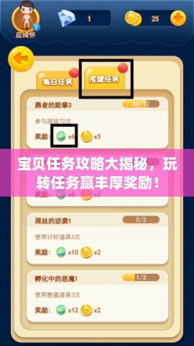 我们需要了解宝贝任务的类型,宝贝任务通常分为日常任务、周常任务、活动任务和成就任务,日常任务简单易懂,每天都可以完成;周常任务则是一周一次,奖励丰厚;活动任务与游戏内的活动相关联,具有时效性;成就任务则需要玩家达到一定的游戏成就才能解锁。
