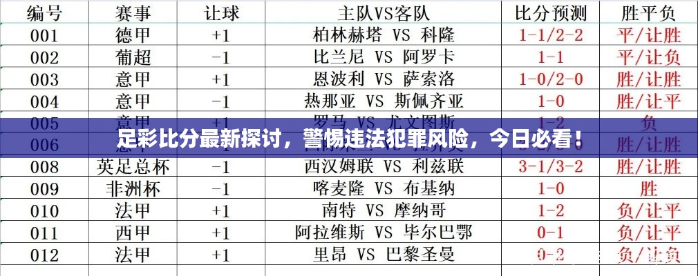 在当今社会,足球彩票已经成为许多人娱乐和投资的热门选择,随着信息技术的快速发展,人们获取足球赛事信息、彩票比分的渠道日益丰富,在追求“足彩比分今日推荐最新”的过程中,我们必须保持清醒的头脑,警惕其中可能存在的违法犯罪风险。