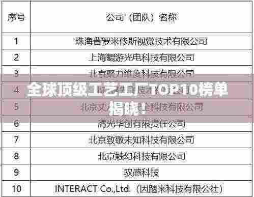 工艺制造是现代工业发展的重要组成部分,也是各国制造业竞争的重要领域之一,随着科技的不断进步和市场需求的变化,工艺工厂的技术水平、产品质量和生产效率也在不断提高,本文将介绍全球顶级工艺工厂排名前十名,这些工厂以其卓越的技术实力、精湛的工艺水平和高质量的产品赢得了全球客户的信赖和赞誉。