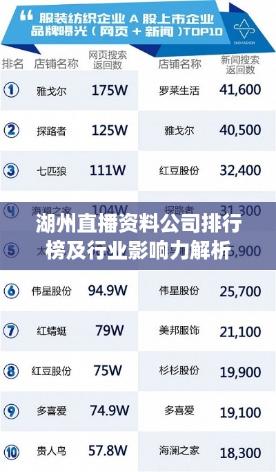 湖州地区的直播资料公司在行业内具有广泛的影响力,为当地经济发展做出了重要贡献,本文通过对湖州直播资料公司的排名和行业影响力的分析,揭示了这一领域的现状和未来趋势,希望读者通过本文能够更加了解湖州直播资料公司的发展状况和未来挑战。