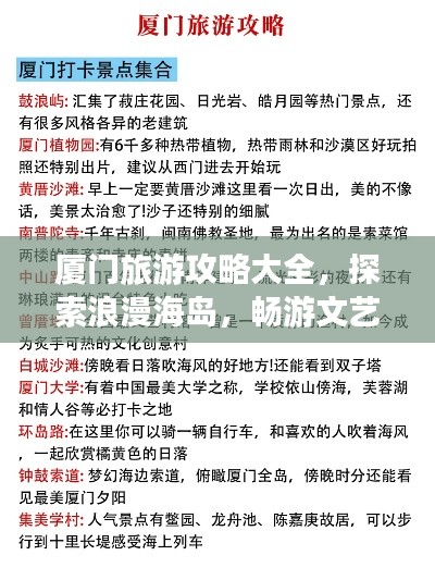 厦门,这座美丽的滨海城市,以其独特的魅力吸引着无数游客,你可以感受到浓厚的历史底蕴,欣赏到美丽的自然风光,品尝到地道的美食,享受到悠闲的生活氛围,本篇攻略将带你领略厦门的精华,让你的旅行更加精彩。